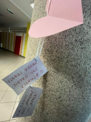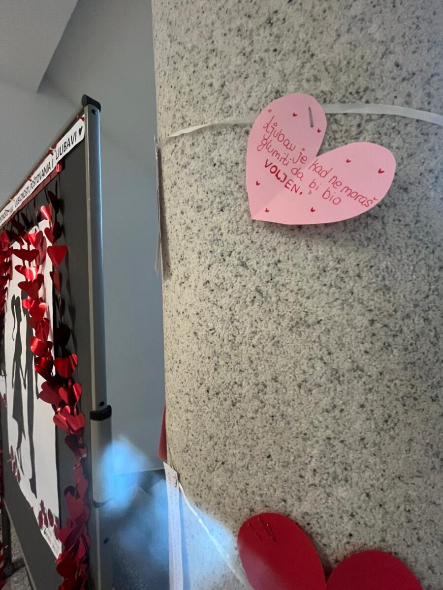 I ove godine u našoj školi obilježen je Dan zaljubljenih te spomendan na svetog Valentina – Valentinovo. Školski hodnici ukrašeni su brojnim crvenim i ružičastim srcima, plakatima i drugum učeničkim radovima. U nekim razredima održane su kreativne radionice na kojima su učenici izrađivali čestitke za svoje najmilije i plakate s porukama o prijateljstvu i poštovanju.